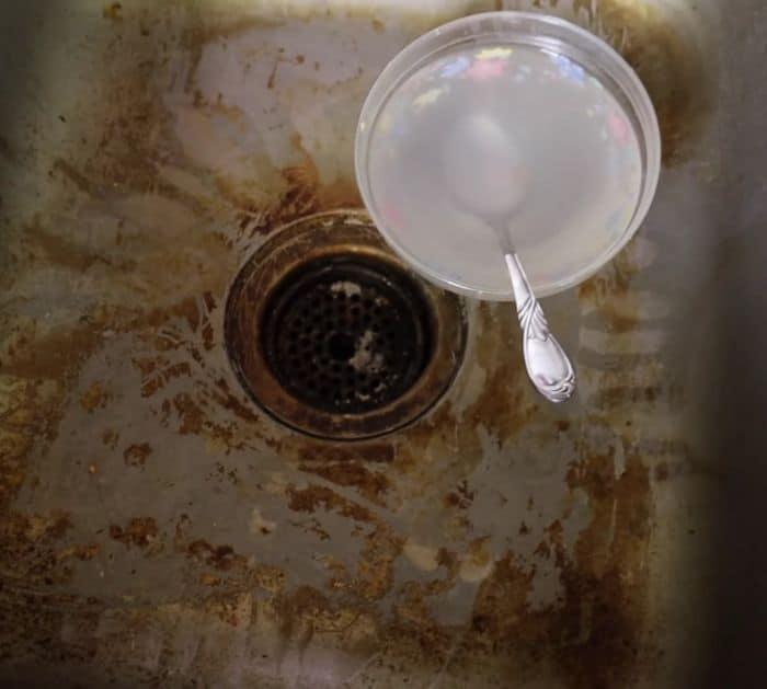 Stellen Sie zunächst sicher, dass Sie geeignete Reinigungshandschuhe und eine Maske tragen, wenn Sie empfindlich auf den starken Geruch einiger Reinigungsmittel reagieren, und entfernen Sie dann alle schmutzigen Handtücher, Schwämme usw. und wirf sie in den Müll. Sprühen Sie Dawn Powerwash auf das gesamte Spülbecken, wischen oder schrubben Sie es dann gründlich ab, um Schmutzansammlungen zu entfernen, und spülen Sie es anschließend gut ab. Wenn das nicht funktioniert, sprühen Sie Easy Off großzügig auf die Spüle, lassen Sie es dann etwa 30 Minuten einwirken und beginnen Sie mit der Beseitigung aller Verschmutzungen. Gut ausspülen und anschließend mit Bar Keeper’s Friend den verbleibenden Schmutz in den Spalten und Ecken des Spülbeckens entfernen und reinigen. Abschließend verwenden Sie den Kalk- und Rostentferner, um etwaigen Rost rund um das Waschbecken, den Wasserhahn und andere Bereiche zu entfernen. Wenn Sie mit dem Abspülen und Abwischen des Spülbeckens fertig sind, ersetzen Sie unbedingt alle weggeworfenen Werkzeuge durch neue, saubere.