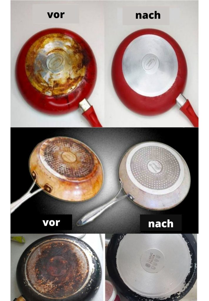 Ist Ihre Pfanne oder Ihr Topf durch das Gas schwarz geworden? Hat sich sogar eine schwarze Kruste auf der Unterseite gebildet? Das passiert beim Kochen oder wenn ein Gericht übergekocht ist… Passen Sie auf, dass Sie die Beschichtung Ihrer Antihaft- oder Induktionspfanne nicht durch wildes Schrubben beschädigen! Angesichts des Preises dieser Pfannen wäre das eine Schande …