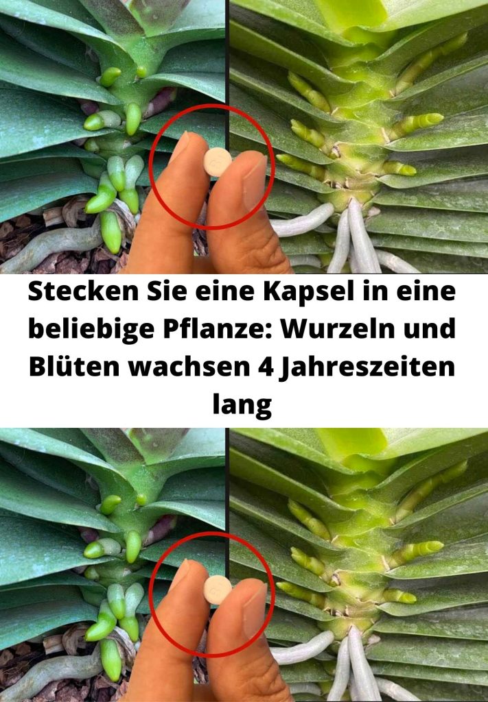 Dann nehmen wir 5 Kapseln Vitamin B1 für Pflanzen und fügen sie zu 500 ml Wasser hinzu. Vitamin B1 ist ideal für die Ernährung der Orchidee, da es das Wachstum der Pflanze und der Wurzeln anregt.